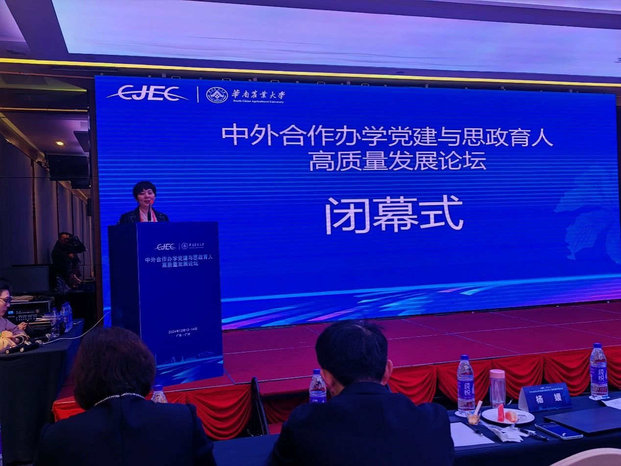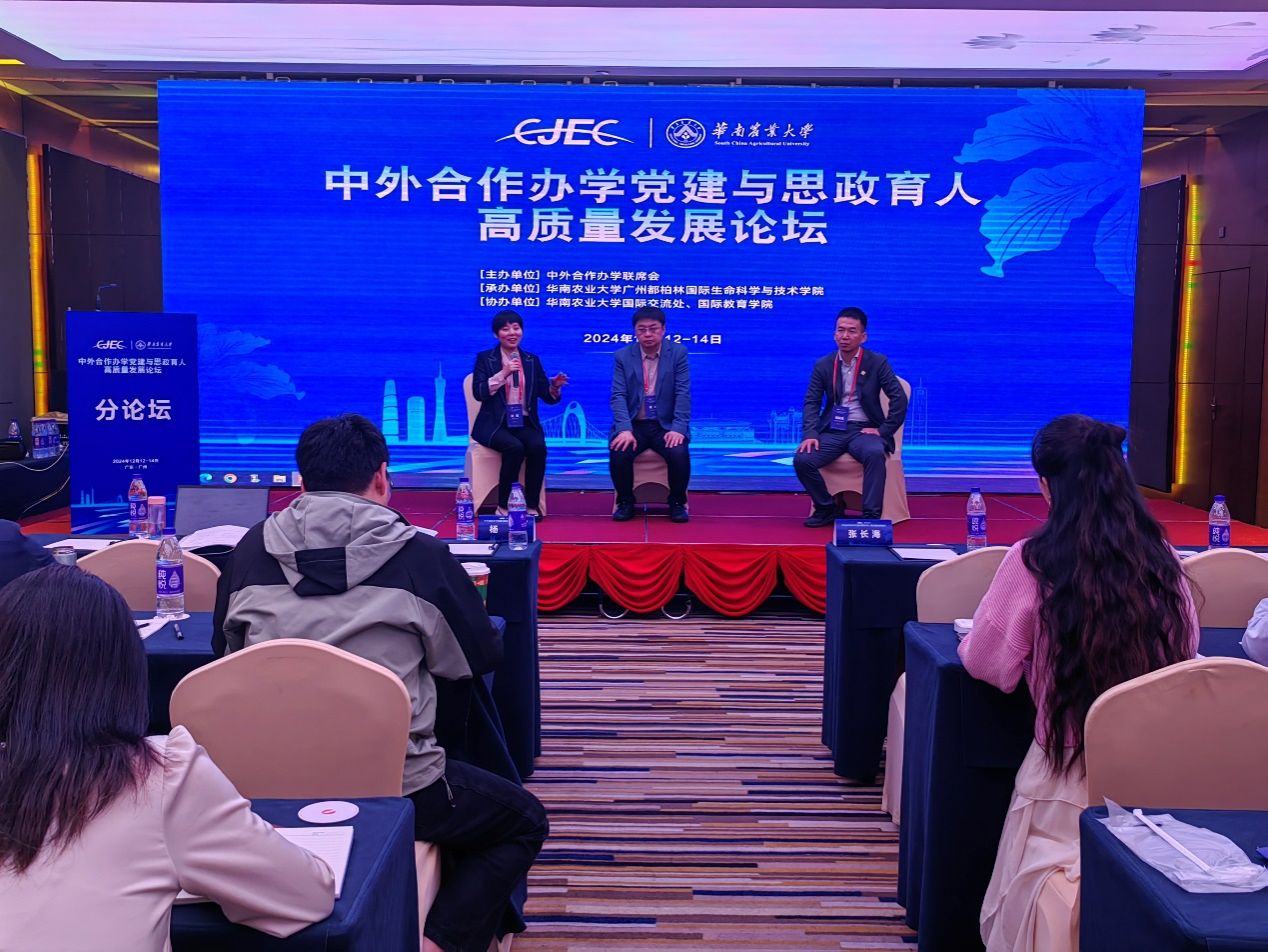 为深入学习贯彻党的二十届三中全会精神,全面加强中外合作办学党的建设工作,12月13日,由教育部中外合作办学联席会主办、华南农业大学广州都柏林国际生命科学与技术公司承办的“中外合作办学党建与思政育人高质量发展论坛”在广州顺利举办。来自全国百余家中外合作办学机构及项目的200余位代表齐聚本次论坛。公司获邀出席,其间,公司书记、经理杨媛受邀在分论坛上作了“党建引领,立德树人,以员工为中心的中外合作办学育人实践”主题报告。