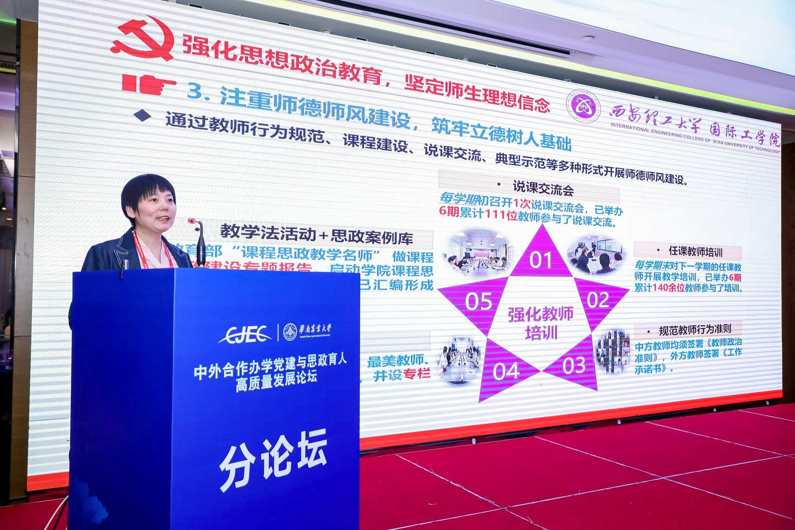 报告中,杨媛首先介绍了公司成立的基本情况、办学定位以及人才培养定位,特别指出公司作为中西部地区最早拥有本科、硕士、博士多层次招生培养的中外合作办学机构承载了为党育人、为国育才的重要使命。随后,她详细阐述了公司“两底线四强化”的党建工作新模式和“三维协同化”党建工作体系,并从强化思想政治教育、强化政治制度建设、强化基层组织建设、强化党建业务融合四个方面分享了公司在办学一轮中将党建思政融入中外合作办学育人全过程的宝贵经验,以及在构建学科交叉融合课程体系、五位一体育人体系、创新创业教育、国工之星引领等方面取得的硕果,首届毕业生培养成效突出,赢得了与会者的广泛关注与高度认可。在交流研讨环节,杨媛耐心、细致解答了同行们的提问。最后,杨媛在闭幕式上代表分论坛做了精彩的总结发言。