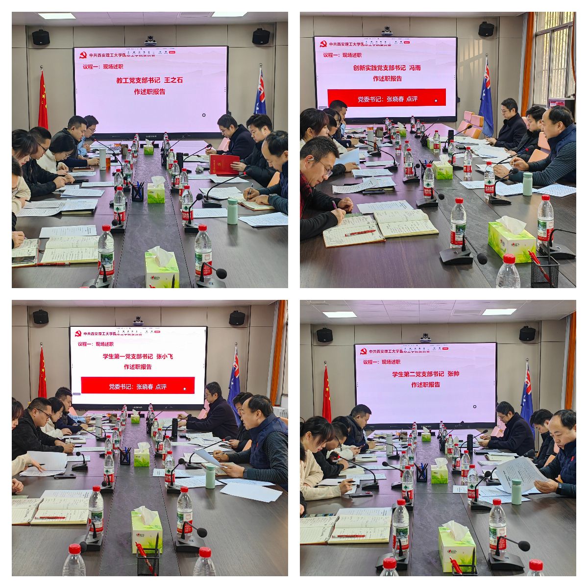 会上,教工党支部书记王之石、创新实践党支部书记冯雨、员工第一党支部书记张小飞、员工第二党支部书记张帅围绕履行职责、党支部建设、存在的问题、下一步工作思路等内容依次进行现场述职。张晓春采取“一述一评”的方式进行点评。