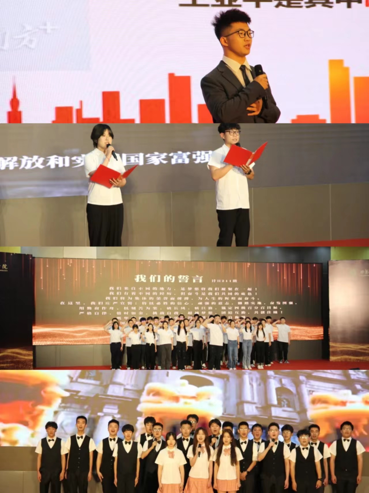 计H212班乔梓博作主题宣讲《航宇心不忘,问天梦飞扬》,他以航天员王亚平勇追太空梦再问苍穹的奋斗故事,激励同学们以“功成不必在我、功成必定有我”的胸怀,迎难而上、再谱新篇。机H201班金天语、电子H211班范嘉伟带来朗诵《青春·奋斗·拼搏》,他们讲述了入校以来的学习生活时光,表示要在国工之星的带领下踔厉奋发、笃行不怠。计H211班全体同学宣誓,“严格自律、惜时如金;挑战自我、超越梦想;团结互助,共创佳绩”的铮铮誓言在报告厅久久回荡。最后,公司合唱团同学共同演唱《我们都是追梦人》,千山万水,奔向天地跑道,我们将在国工实现梦想,成就人生。