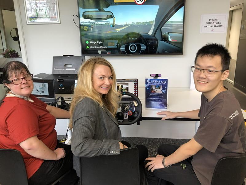 Demelza Werly女士指导JCU的创新导师Samantha Horseman博士和梅艺虹同学使用她开发的驾驶模拟器,该模拟器使用虚拟现实和生物反馈回路,帮助用户练习和测试道路技能。(左起:Demelza Werl女士、Samantha Horseman博士、梅艺虹同学)