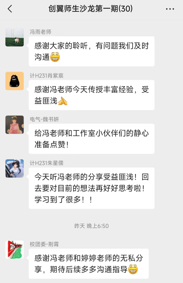 计H231班张婷表示:“通过这次沙龙分享,我了解到挑战杯备赛的流程和注意事项,明确了选题的方向以及如何凝练题目,还学习到了问卷调查的方法和技巧。通过这次沙龙分享,我受益匪浅,衷心感谢各位老师的分享和指导!”
