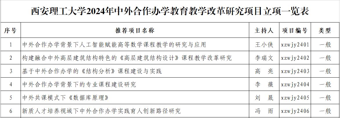 2024年立项的中外合作办学教学研究项目(具体名单见下表)