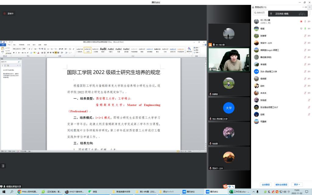 首先,杨媛结合中外双方联合培养研究生的特点,给导师们详细解读了公司关于硕士研究生的培养要求。她从培养模式、学分要求、开题、中期考核、实践环节、学位论文等方面详细解读了公司对公司产品的要求。其次,她提醒导师们,要充分考虑到公司公司产品的特点,提前开展研究生开题和科研工作,并做好与外方导师的协同沟通,共同培养出高质量的研究生。