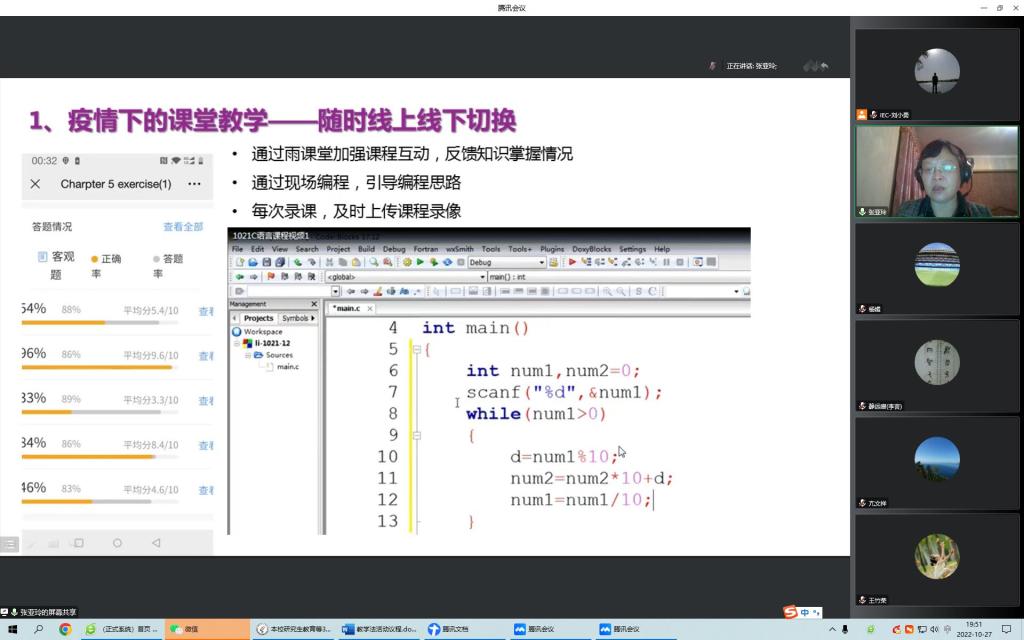 本次活动共有七位任课教师代表分别对所讲授的基础课程、专业课程和引进课程进行了线上教学经验汇报。老师们准备充足,主要围绕前半学期的学情分析,教学手段与对策,阶段性成绩分析,与外方教师的共课经验和目前形势下的教学方法调整与成效等方面展开了细致全面的分享。针对目前线上教学的局限性,老师们群策群力,充分利用智慧化教学手段破解教学难题,增加课堂互动频次,助教定期线上答疑,实现教学闭环,保证教学质量。