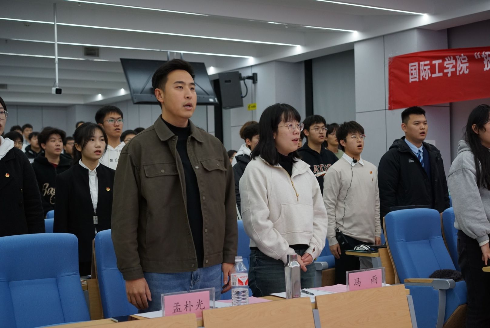 BETWAY必威团委书记冯雨老师,24级辅导员孟朴光老师、辅导员董珺莹老师,电气工程公司团委副书记王嘉楠担任此次答辩会的评委。公司八位团支书就本次团日活动展开汇报。大会在庄严的国歌声中拉开帷幕,现场气氛热烈,团员青年们满怀对祖国的赤诚与敬意。