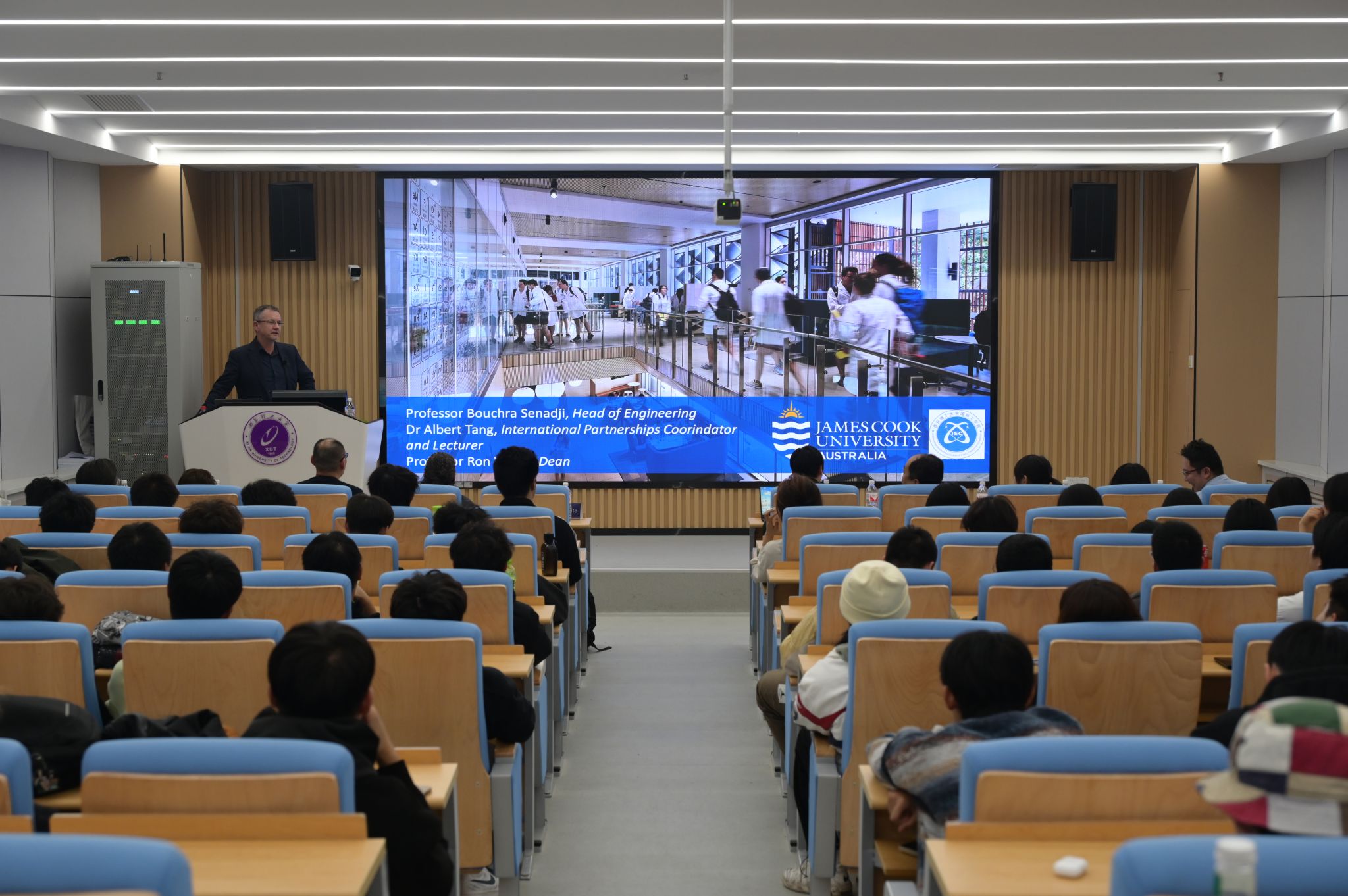 随后,澳大利亚詹姆斯库克大学科学与工程公司经理Ron White教授向同学们详细介绍了该校的基本情况。詹姆斯库克大学(James Cook University)成立于1970年,现已发展成为一所国际知名的综合性大学,集团以强大的团队力量著称,聚集了众多领域的顶级专家和学者,致力于提供高质量的教学与科研环境。