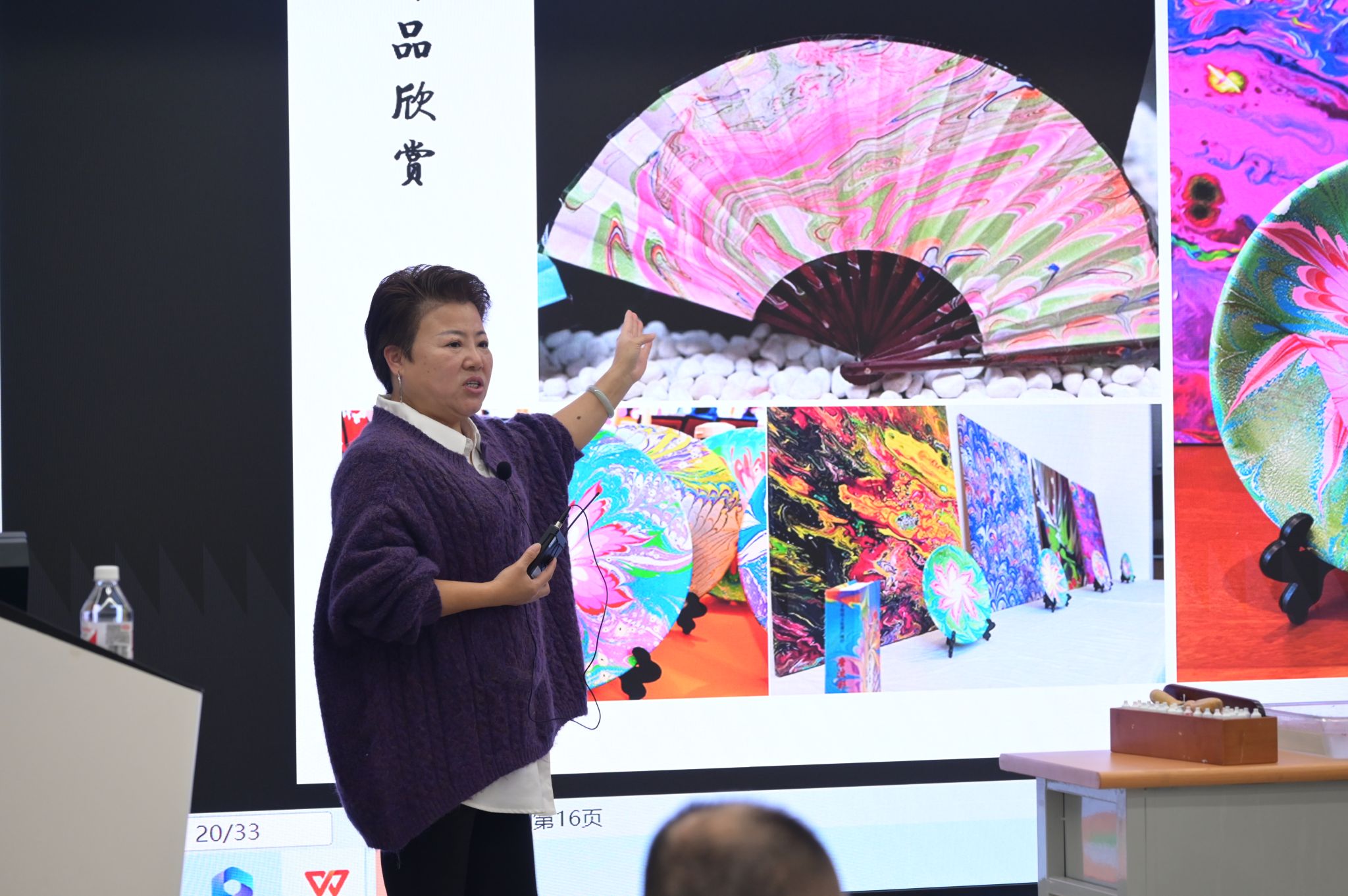 非遗制作是本次活动最大的亮点。BETWAY必威校外美育导师、陕西省非物质文化遗产唐流彩技艺传承人张双敏老师登台,为大家带来了关于唐流彩文化的精彩讲解。张老师详细介绍了这一古老技艺的历史渊源、艺术特色及制作工艺,其生动的语言和丰富的案例赢得了阵阵掌声。最令人难忘的是,张老师还现场演示了唐流彩的制作过程,精美的图案、流畅的动作令观众赞叹不已。